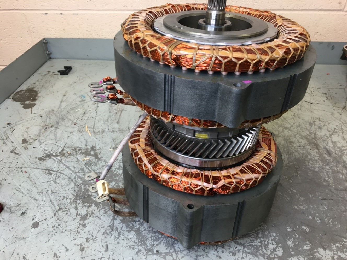Figure 1. The MG1 and MG2 Motor-Generator Stack for a hybrid vehicle. You can see to the assembly’s left where the three-phase heavy current cables hook to the motor phases. This is usually done at a ceramic (or insulated) junction block. These motor-generators work inside the vehicle’s transmission to propel and charge the vehicle (Photo Courtesy of DiagNation.com Training).