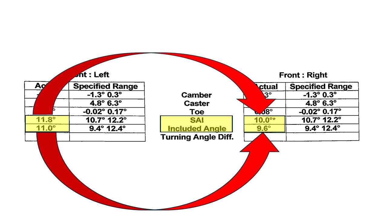 What you need to know: Stop! Don’t turn another wrench! We can tell if a suspension and/or steering component is “bent” by two, non-adjustable angles: steering axis inclination (SAI) and included angle (IA). The SAI is the “line” between the upper ball joint or strut tower down to the lower ball joint. The second angle line is true vertical, or 180 degrees; up/down. The arc between these two lines is the SAI angle.