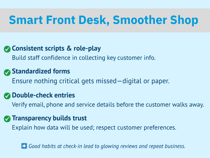 The front desk sets the tone for a smooth service experience. With the right tools and training, they can gather key information without slowing things down.