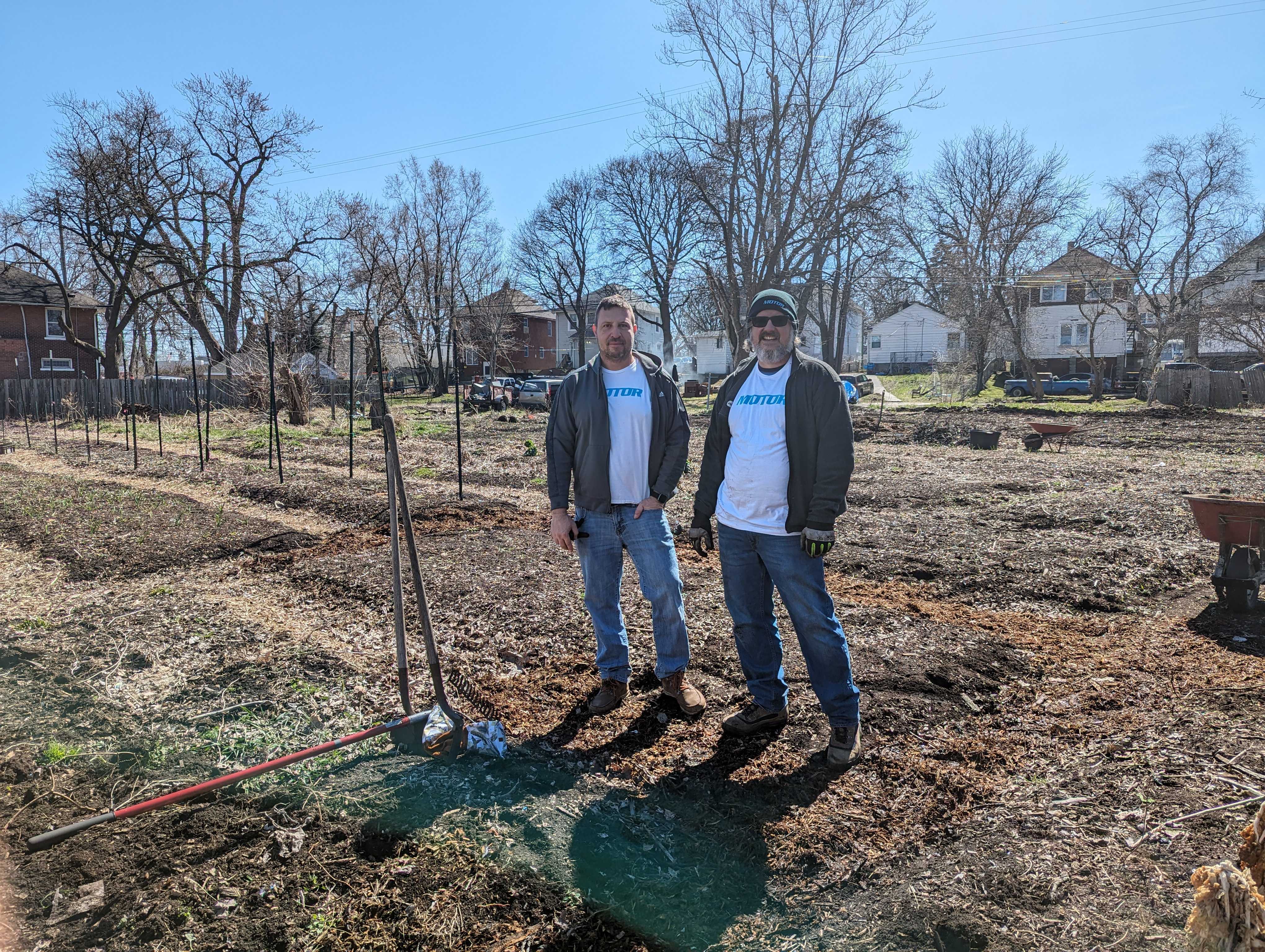 In addition to the handful of efforts at Forgotten Harvest that kicked off the year, other MOTOR employees opted to dedicate their time to support ReRoot Pontiac in its mission to cultivate community gardens. MOTOR’s DJ Blake and Dave Nemshick helped prepare the community garden for the year ahead. They helped dig trenches and paths for keyhole gardens and spread several yards of woodchips throughout. For MOTOR, these efforts contributed to fostering a sense of belonging and nurtured connections with the local community.
