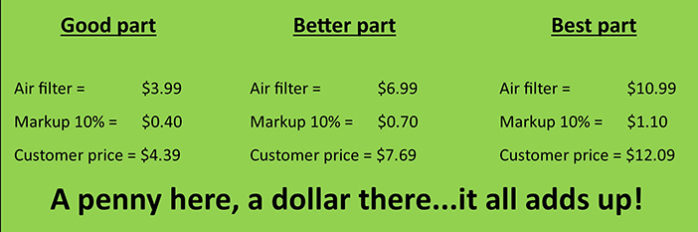- Buying “cheap” parts: We all know that there are good, better and best parts. And you make money and add more customers to your base when you use the better or best part for the job. Let the customer be part of the repair by telling them the pros and cons of each part alternative. Then, ask for the best job.