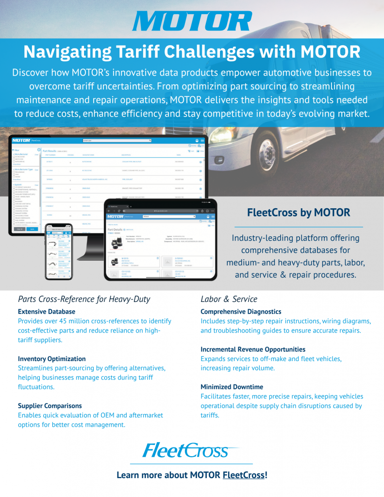 MOTOR’s Tariff Toolkit provides resources to help you navigate these changes, including insights into the top challenges facing OEMs, fleet operators, part manufacturers, technology providers, and service and repair businesses. Explore MOTOR’s free e-books, actionable solutions, and a webinar recording with industry experts. Watch the clip below and access the tools you need to thrive in today’s complex market.
