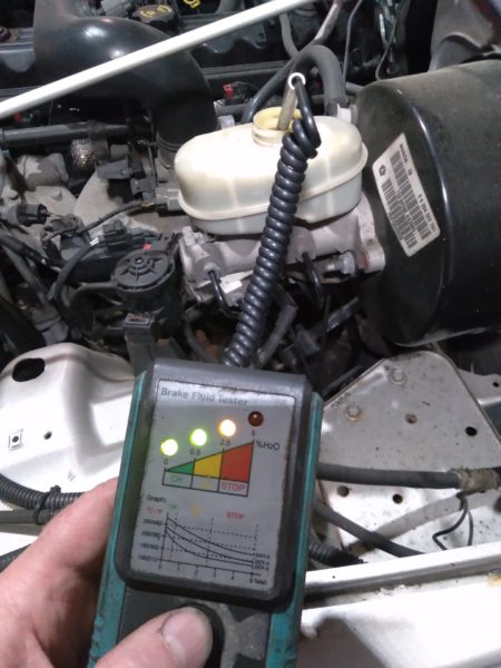 Testers like this moisture content reader are inexpensive and can help identify high moisture in brake fluid. Changing out high moisture fluid will lessen the internal damage to brake components like calipers and hydraulic control units (image owned by Pete Rudloff).