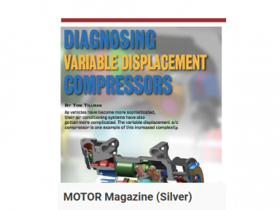 The article “Diagnosing Variable Displacement Compressors,” written by Tom Tillman for the April 2017 issue of MOTOR Magazine, received a Silver Editorial Award for a How-To Article. Additionally, the magazine received an honorable mention in the Editor’s Column category for its “Editors Report,” written monthly by John Lypen, as well as an honorable mention for “Brake Shop,” a column by Karl Seyfert.