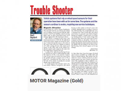 MOTOR Magazine has been honored with four 2020 Tabbie Awards. MOTOR received the Gold Award, Regular Column, for “Trouble Shooter” by Karl Seyfert; Silver in the category of Technical Article for “How Low Can You Go? Abnormal Brake Pedal Diagnosis” by Dennis Ripple; Top 25 Feature Articles for “What to Know About CO2 Emissions,” by Sam Bell; and Top 25 Best Single Issues.