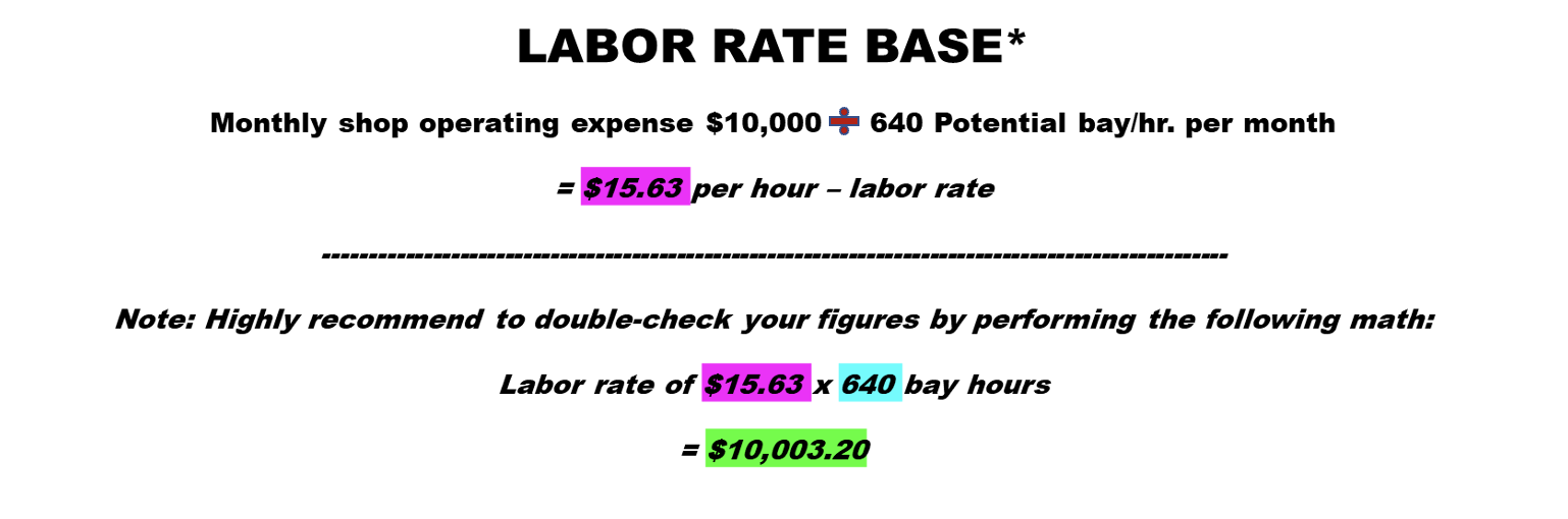 In our “perfect” world, the four technicians would produce 640 hours of labor utilizing the four bays per month. So, our labor rate to keep us in the black would look like this: